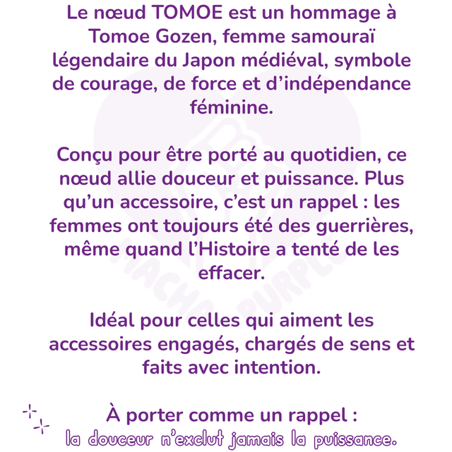 Le noeud TOMOE est un hommage à Tomoe Gozen, femme samouraï légendaire du Japon médiéval, symbole de courage, de force et d’indépendance féminine. Conçu pour être porté au quotidien, ce noeud allie douceur et puissance.